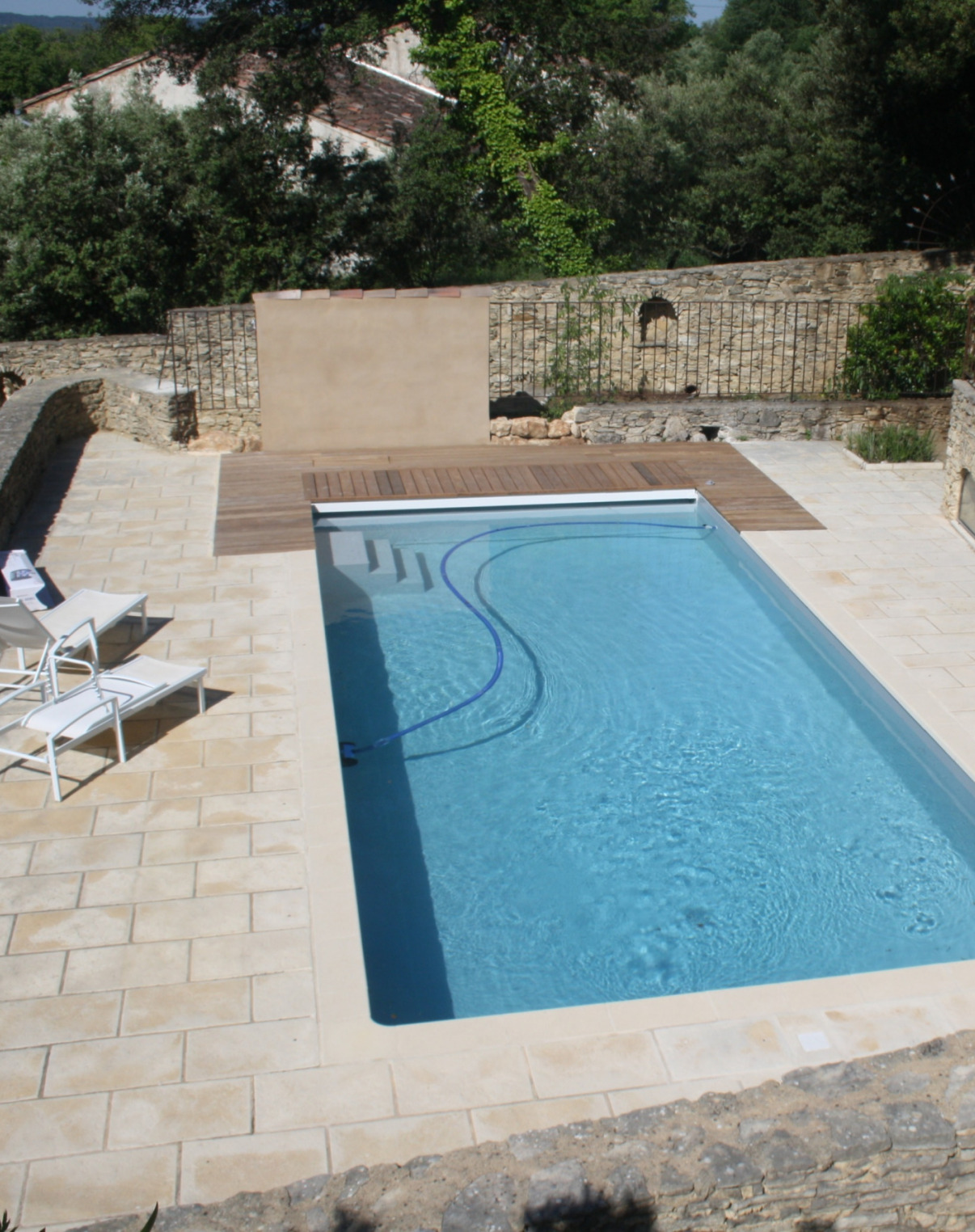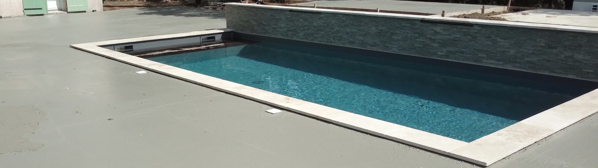 Remplacement d'une piscine Desjoyaux par une de nos créations avec lames d'eau et couverture immergée
