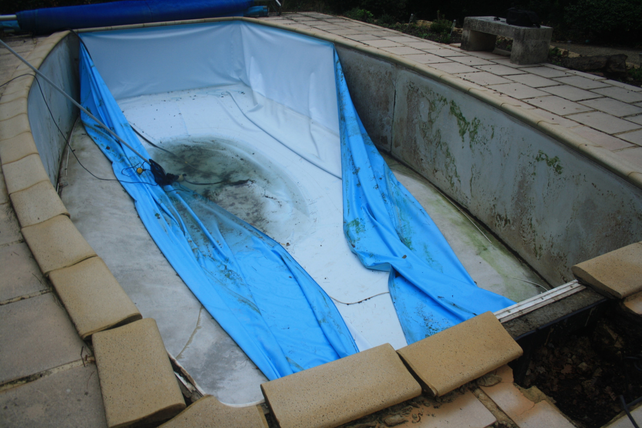Remplacement d'un groupe de filtration Desjoyaux, de l'escalier, du liner et incorporation d'une couverture de piscine immergée